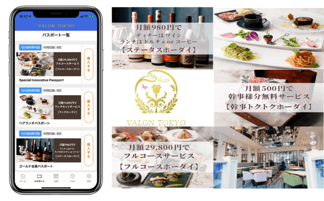 <『VALON TOKYO』公式アプリについて> 月額金額をお支払いいただくと、 「VALON TOKYO」と「Aoneco」の2店舗でイノベーティブイタリアン料理が大変お得に楽しめる定額制サービスです。イノベーティブイタリアン料理やワインをより身近に、 そして多くの方に知っていただくために、 「VALON TOKYO」と「Aoneco」が提供します。 【プラン詳細】 以下4コースからお好きなコースをお選びいただけます。 (※下記金額は税別です。 ) 1.Special Innovative Passport 【フルコースホーダイ】 月額29,800円(税別)をアプリ内でお支払いいただくと、 購入から1か月間、 毎日来店いただいも1日1回フルコース(税別:1人6,500円相当)が楽しめます。 ・会社の接待が多い方やゲストを招きたい時におすすめのコースです。 2.ペアランチパスポート 【ランチホーダイ】 月額9,800円(税別)をアプリ内でお支払いいただくと、 購入から1か月間、 毎日来店いただいても1日2セット(税別:4,000円相当)、 ランチコースがお楽しみいただけます。 ・ランチ会議をする方やお近くにお住いの方におすすめのコースです。 3.ゴールド会員パスポート 【ステータスホーダイ】 月額980円(税別)をアプリ内でお支払いいただくと、 購入から1か月間、 毎日来店いただいてもワインもしくはコーヒーorドルチェをゲストの皆様にもご提供させていただきます。 ・接待でのご利用やお近くにお住まいの方がゲストをもてなしたい時におすすめのコースです。 ※「VALON TOKYO」と「Aoneco」の2店舗でご利用可能です。 4.パーティーパスポート 【幹事トクトクホーダイ】 月額500円(税別)をアプリ内でお支払いいただくと、 4名様以上のパーティー仕様コースを(2時間飲み放題付の大皿コースのいずれか)をご利用で幹事1名様分の料金が無料になるサービスです。 ・飲み会好きな方で幹事を任される方におすすめのコースです。 ※「VALON TOKYO」と「Aoneco」の2店舗でご利用可能です。 【利用方法】 1.App Store もしくは Google Play から「VALON TOKYO」アプリをダウンロード 2.アプリ内で月額金額を支払う(※月額金額は課金登録日から1か月ごとの自動更新です。 ) 3.VALON TOKYOとAonecoの2店舗にてアプリ画面を表示 【店舗情報】 ・「VALON TOKYO」錦糸町店 東京都墨田区錦糸4-6-1 ロッテシティホテル錦糸町 1F 営業時間: 11:00~24:00(月~日) ・「Aoneco」森下店 東京都江東区森下1-10-7 大場ビル 1F 営業時間:17:00~23:30(月・水~日) <『ファーストパスポート/サブする』とは> 実店舗でのサブスクリプションサービスをスマホアプリで開始できるパッケージツールです。 現在、 「野郎ラーメン」(株式会社フードリヴァンプ、 本社所在地:東京都世田谷区、 代表取締役社長:林 正勝)にて月額8,600円(税抜)で1日1杯ラーメンをお召し上がりいただけるサービス他、 「カラオケの鉄人」(株式会社鉄人化計画、 本社所在地:東京都目黒区、 代表取締役社長:岡崎 太輔)にて月額1,500円(税抜)で歌い放題サービス、 「ハナノヒ」(株式会社日比谷花壇、 本社所在地:東京都港区、 代表取締役社長:宮島 浩彰)にて月額1,187円(税抜)~店頭でお花を受け取れるサービスを展開しております。